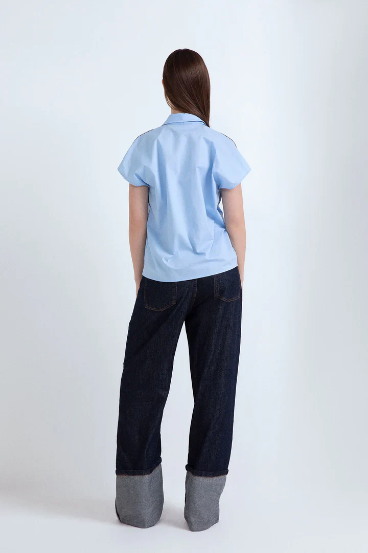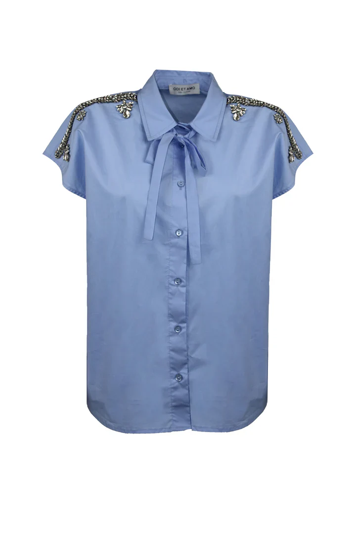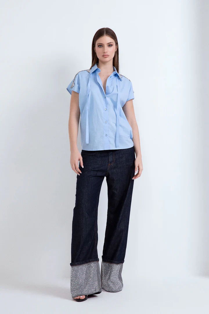 Camicia con maniche a giro sceso in cotone azzurro, con applicazioni gioiello sulle spalle.