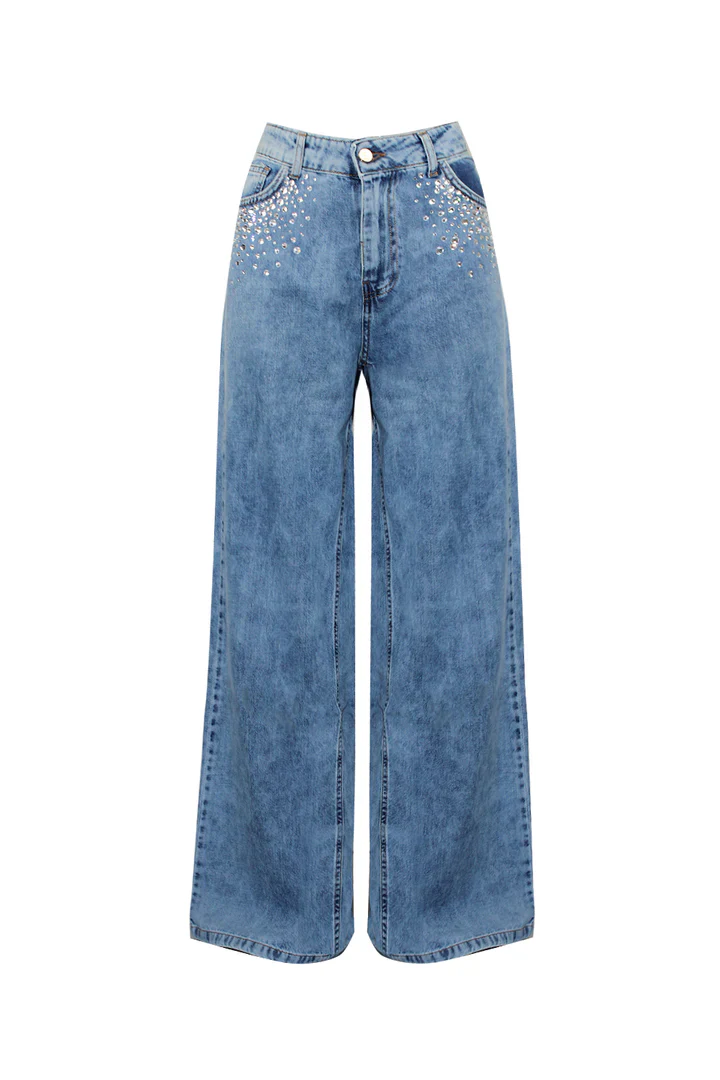 Jeans cinque tasche in denim leggero, modello a gamba larga con dettaglio strass sulle tasche.