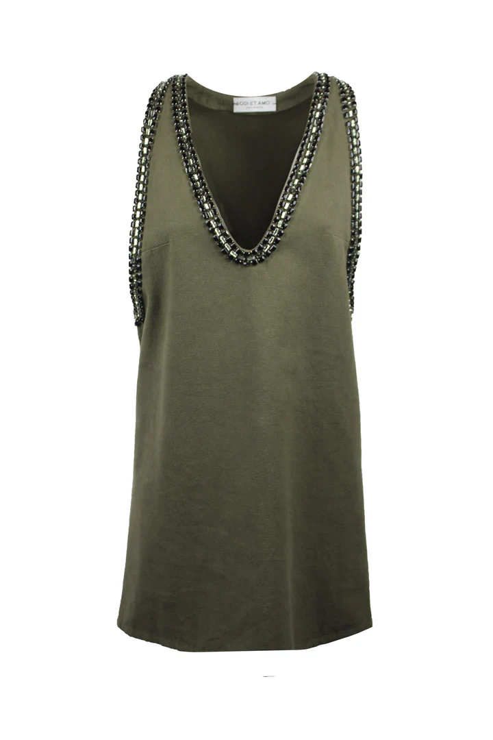 Profili con cristalli sul giro manica e scollatura.