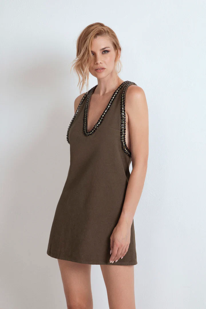 Abito corto modello salopette in denim verde militare, design svasato con scollo profondo a V.