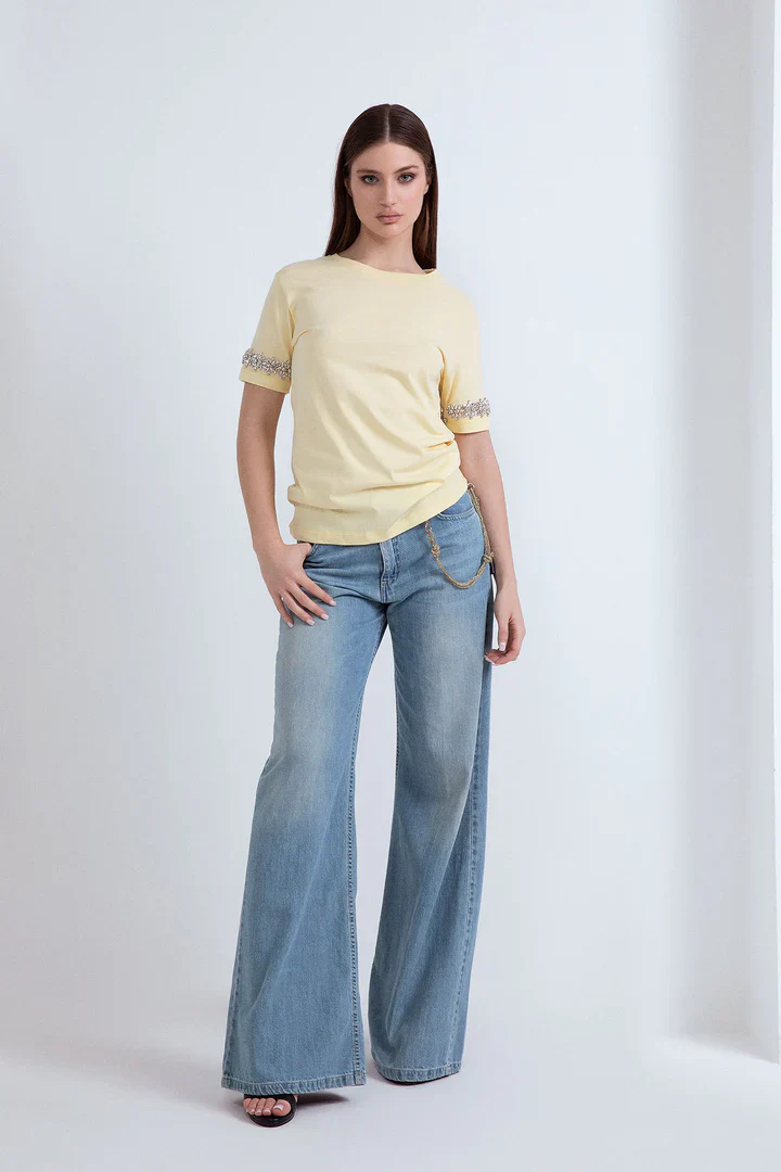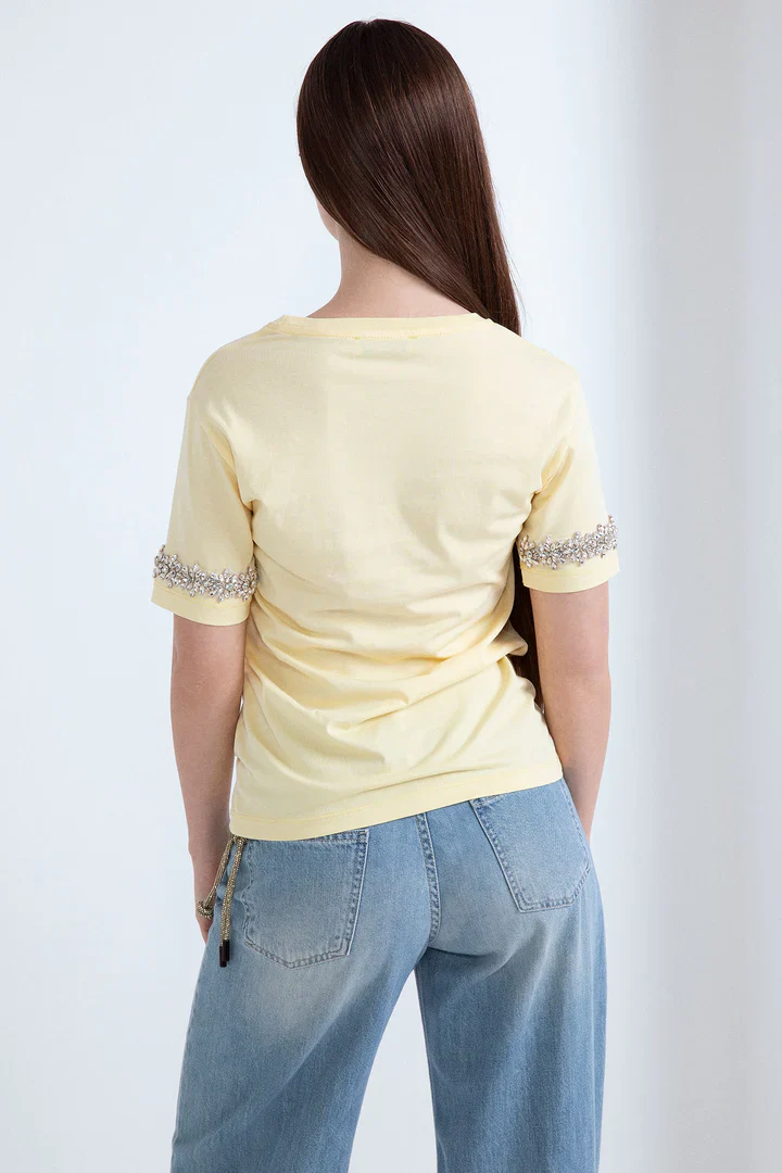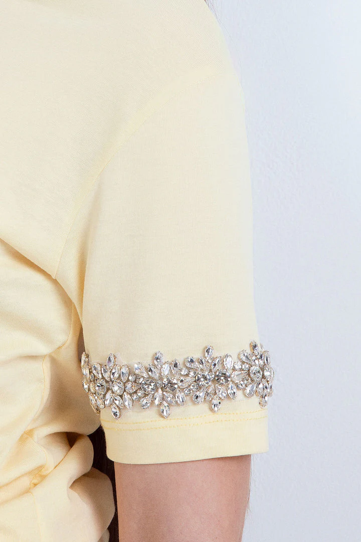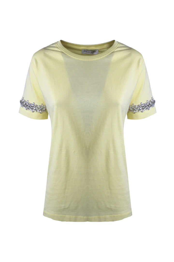 T-shirt in cotone bianca a maniche corte,   applicazione di pietre preziose sulle maniche.